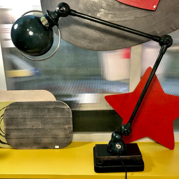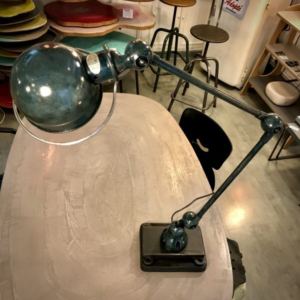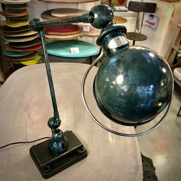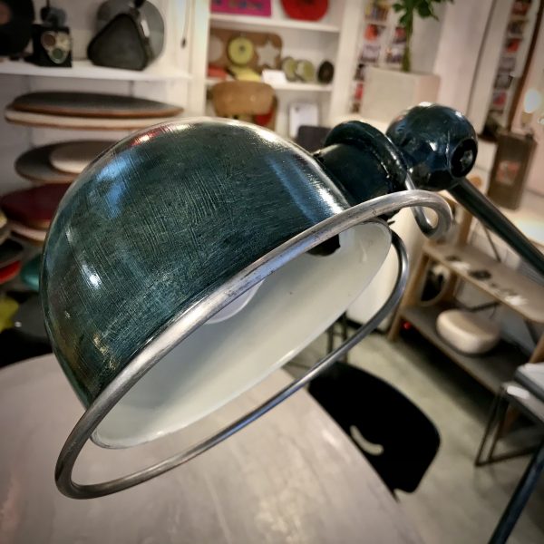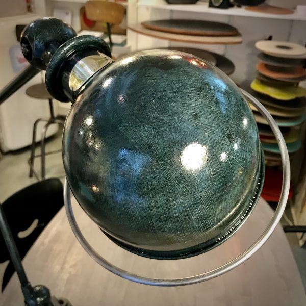 Crée par Domecq Jean-Louis. Édité par "Jieldé" de 1951. Articulée, acier et aluminium, patiné avec un joli glacis à l'huile vert bleu qui met en valeur toute son histoire.
