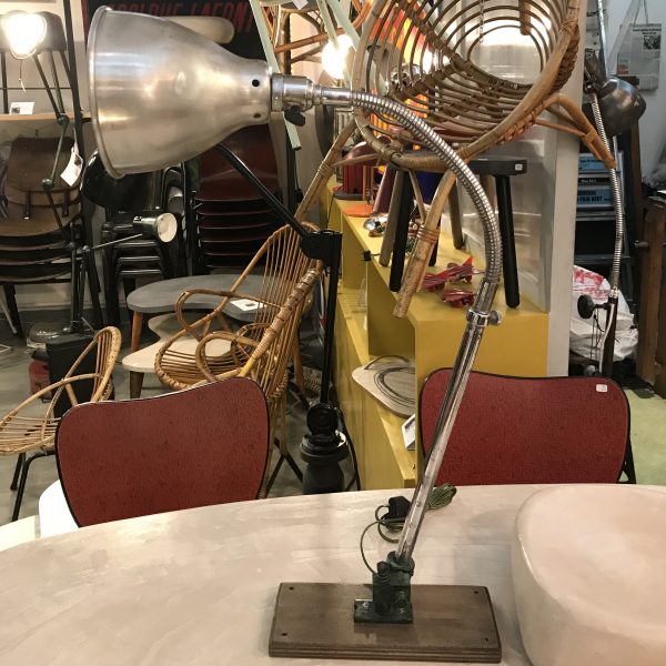 Bras télescopique terminé par un flexible orientable en tous sens. Etau de fixation patiné par un glacis à l'huile et fixé sur une planche en bois permettant la fixation murale.