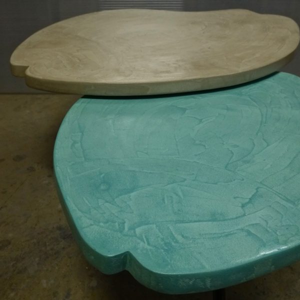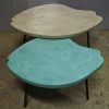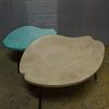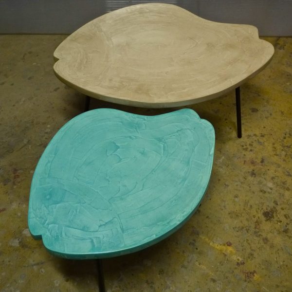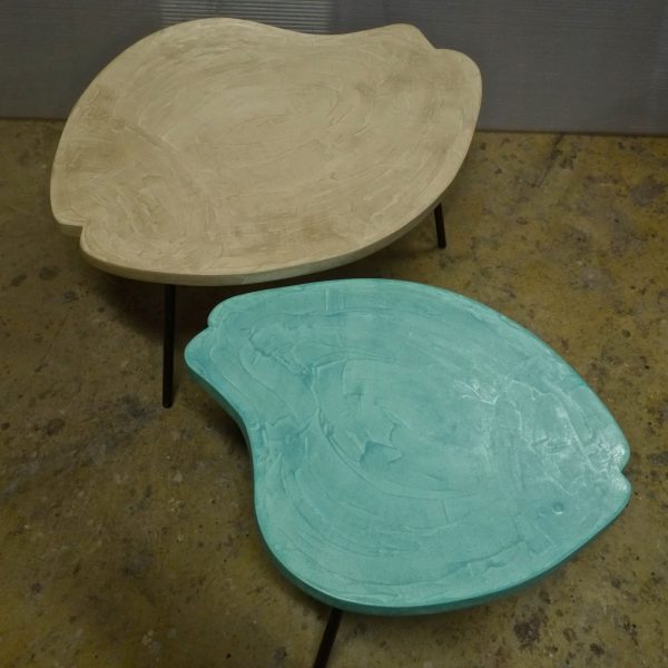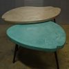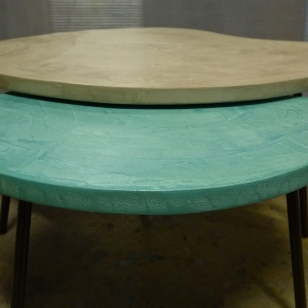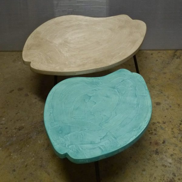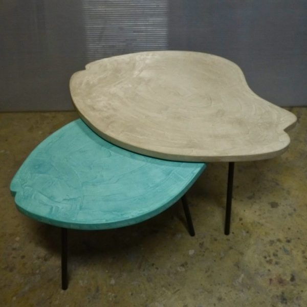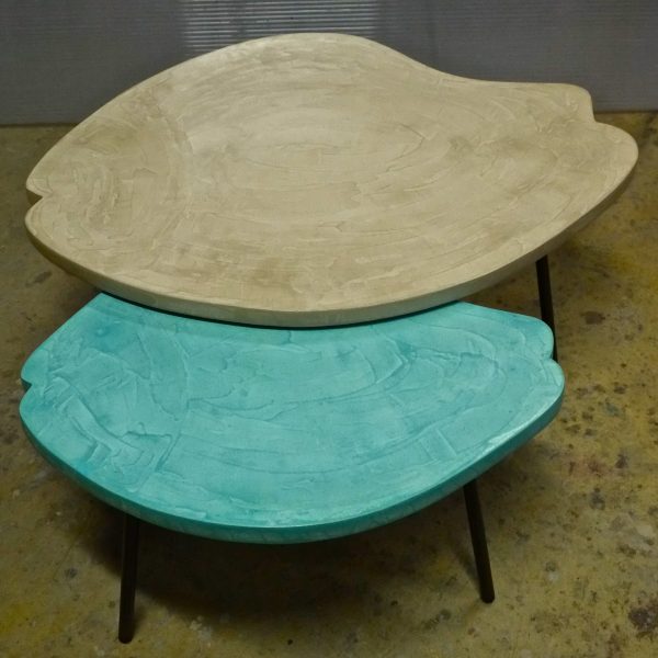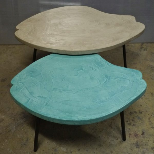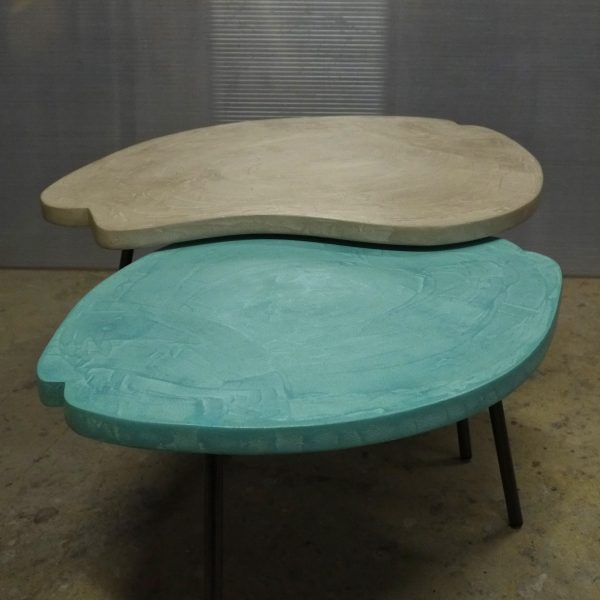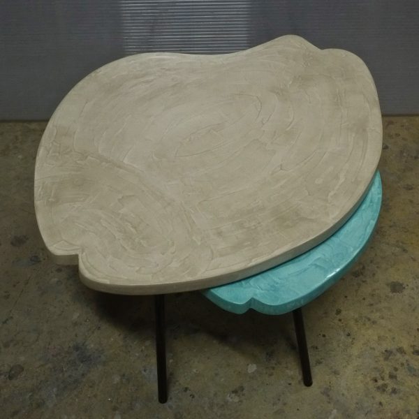 PESCE Tables basses tripodes gigognes, dessus béton, pieds en acier.