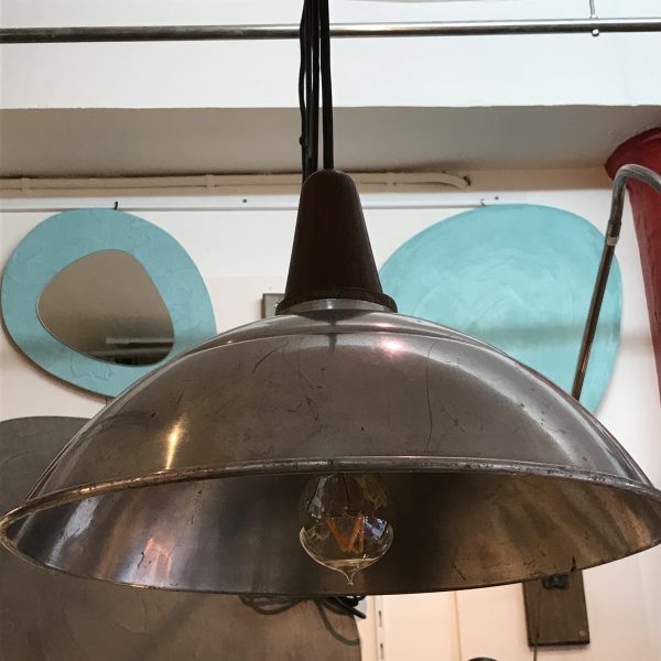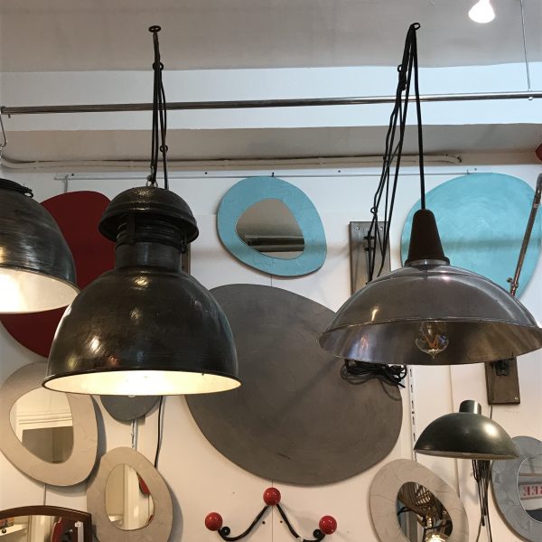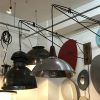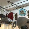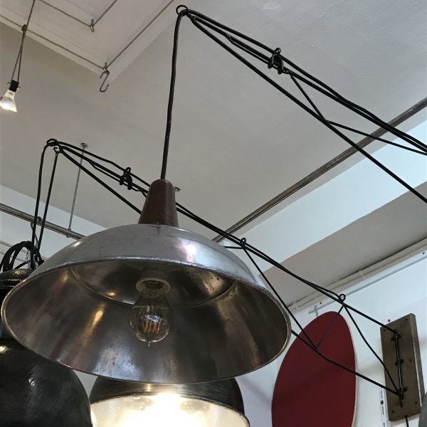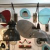 Assemblage avec un bras articulé des anciennes carte d'école et un reflecteur de lampe industrielle.