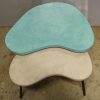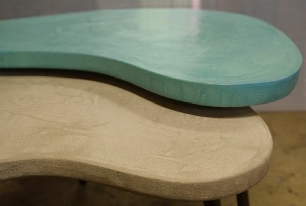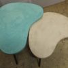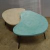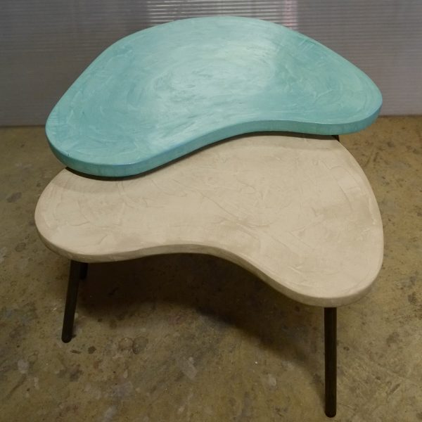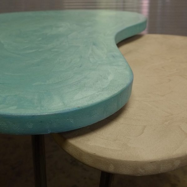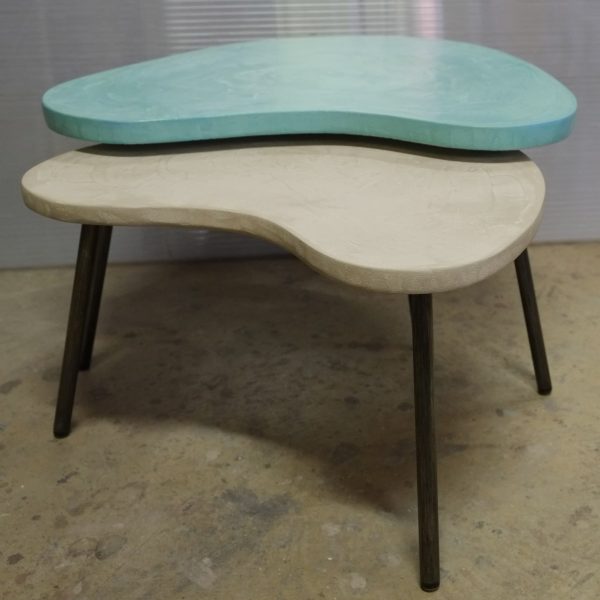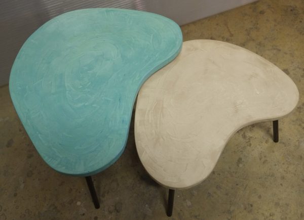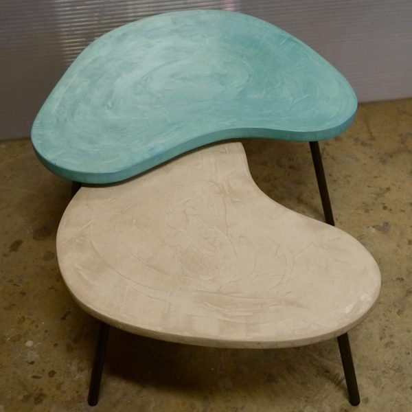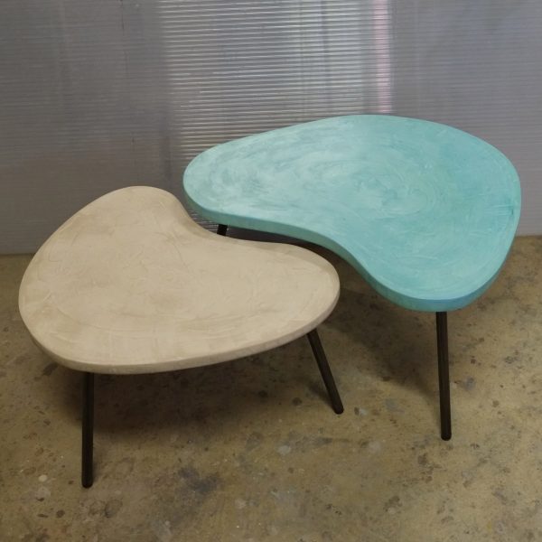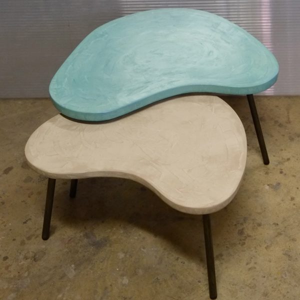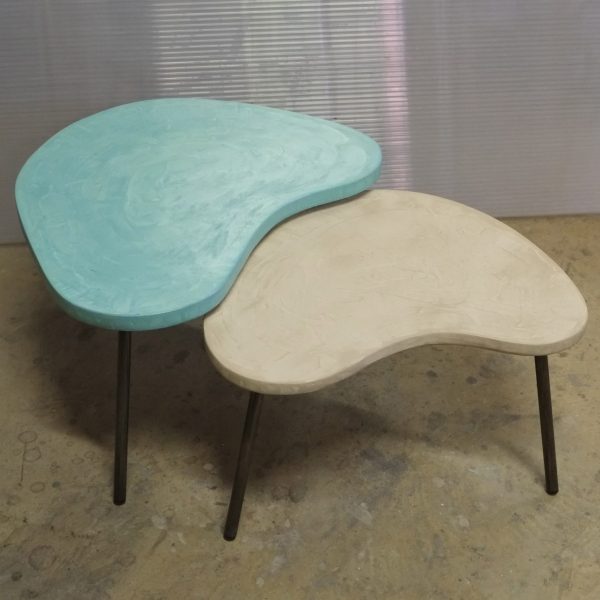 Tables basses tripodes gigognes, dessus béton, pieds en acier. Pièce unique fait main. Couleurs et dimensions au choix sur commande.57x47 h35 / 70x60 h39 cm pour celles ci.