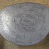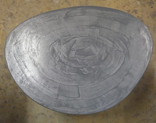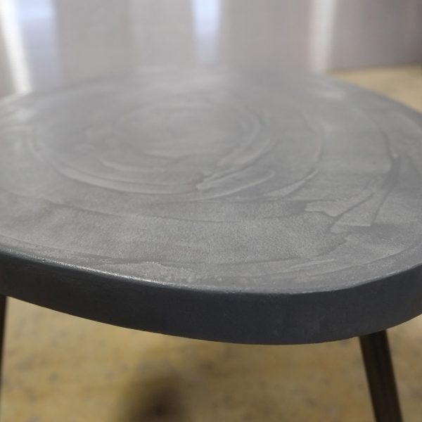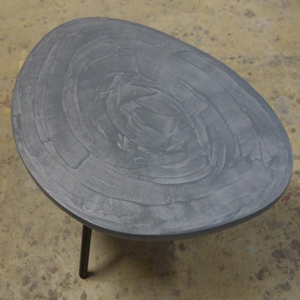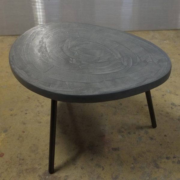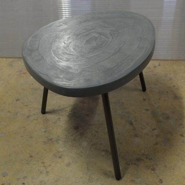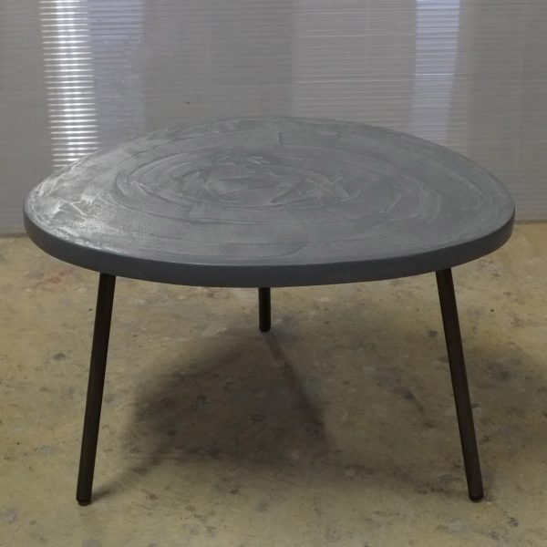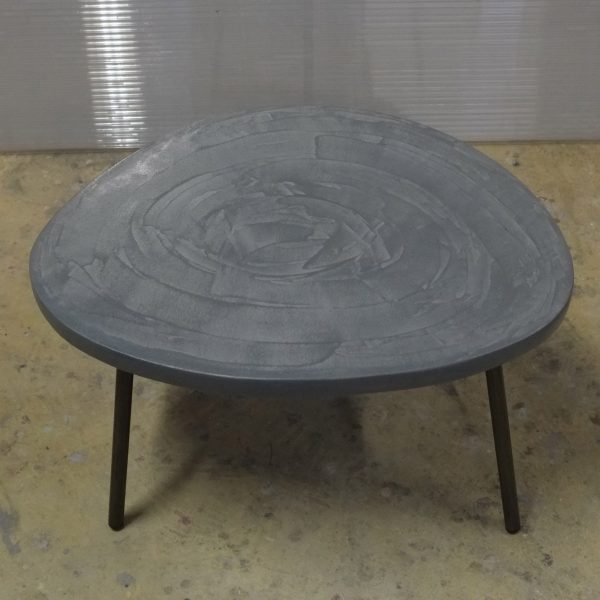 Table basse tripode, dessus béton, pieds en acier.