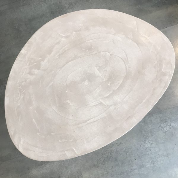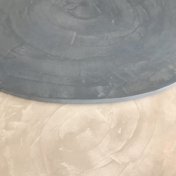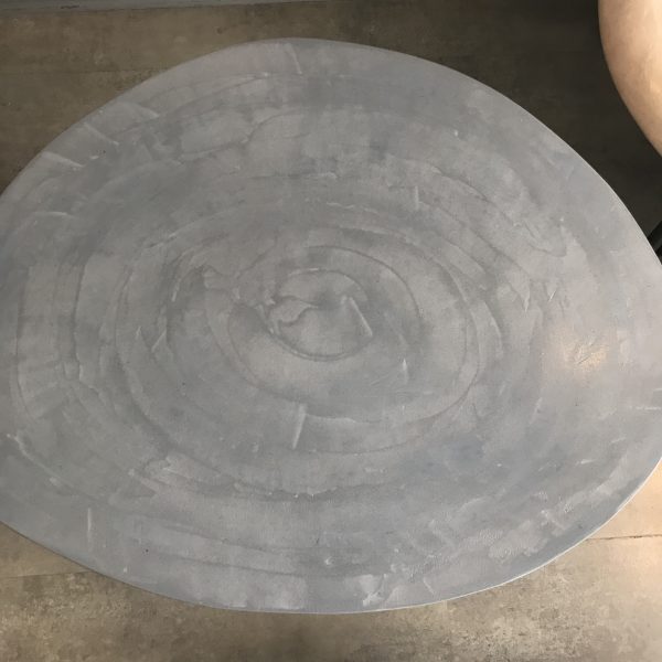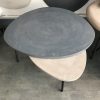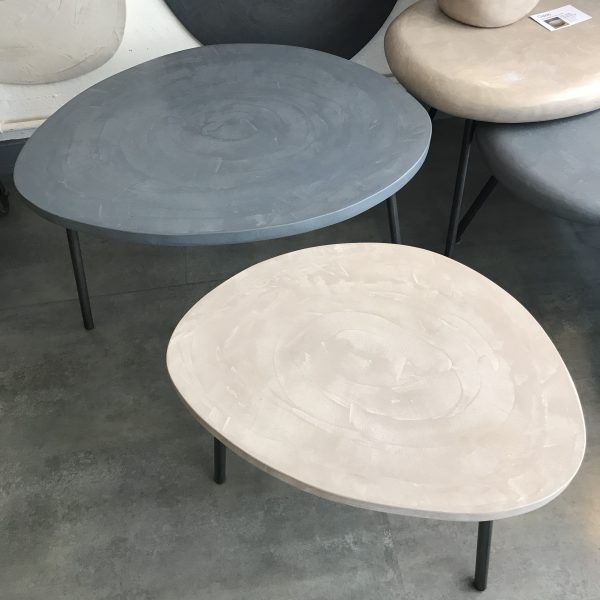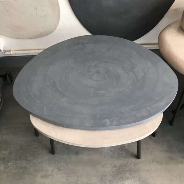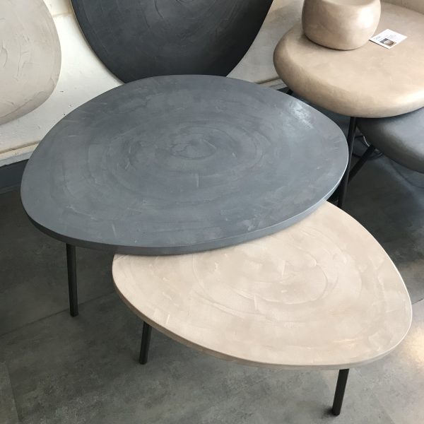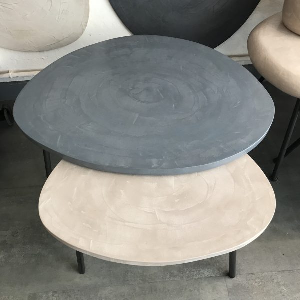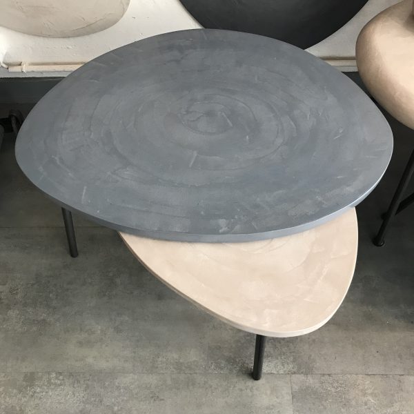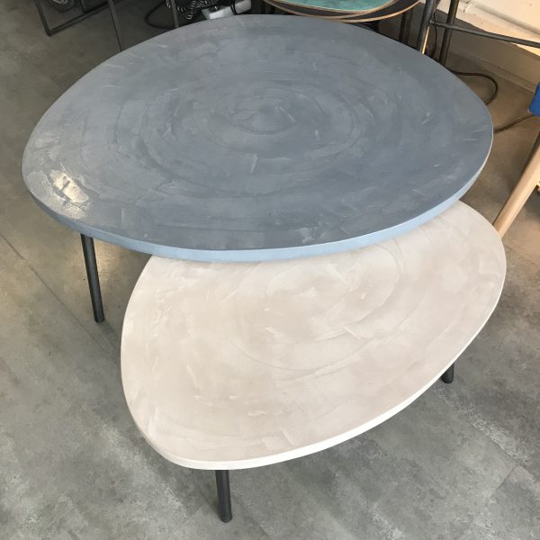 Tables basses tripodes gigognes, dessus béton, pieds en acier.